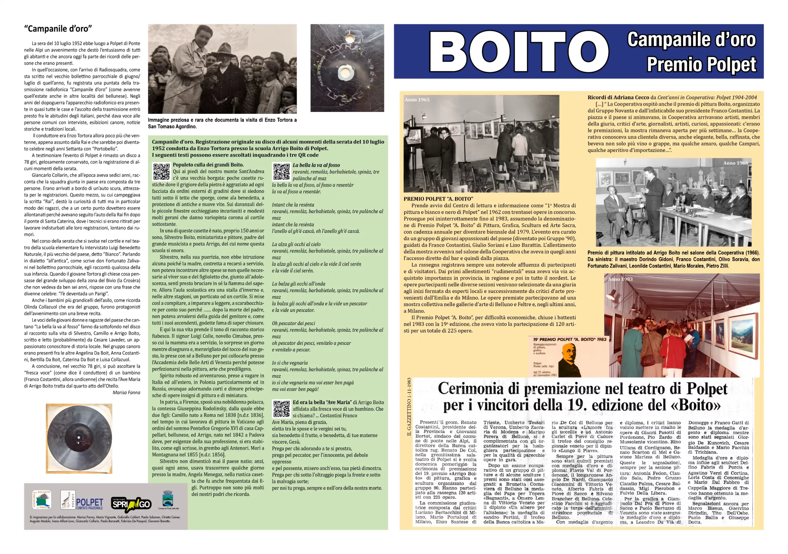 In quell’occasione, con l’arrivo di Radiosquadra, come sta scritto nel vecchio bollettino parrocchiale di giugno/luglio di quell’anno, fu registrata una puntata della trasmissione radiofonica “Campanile d’oro” (come avvenne quell’estate anche in altre località del bellunese). Negli anni del dopoguerra l’apparecchio radiofonico era presente in quasi tutte le case e l’ascolto della trasmissione entrò presto fra le abitudini degli italiani, perché dava voce alle persone comuni con interviste, esibizione canore, notizie storiche e tradizioni locali.